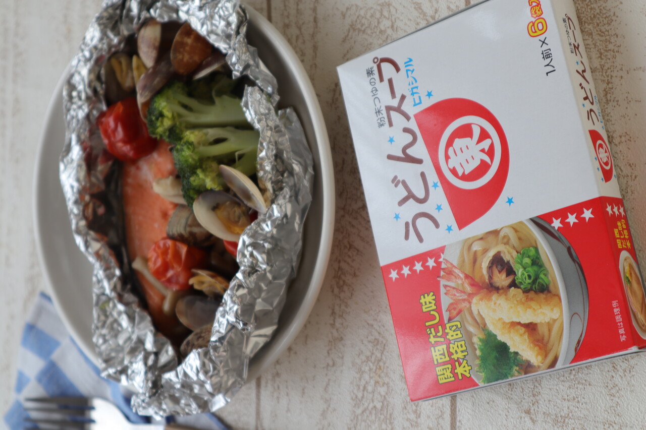 いつものホイル焼きがおしゃれになる、アクアパッツァ風の一品です。ホイル焼きならフライパンやお皿が汚れにくいので、後片付けも簡単。アウトドアにも活躍するレシピです。一品で野菜と魚が摂れ、低カロリーなのでとってもヘルシー!あさりやうどんスープのうま味が野菜にしみこみ、とても美味しいです。