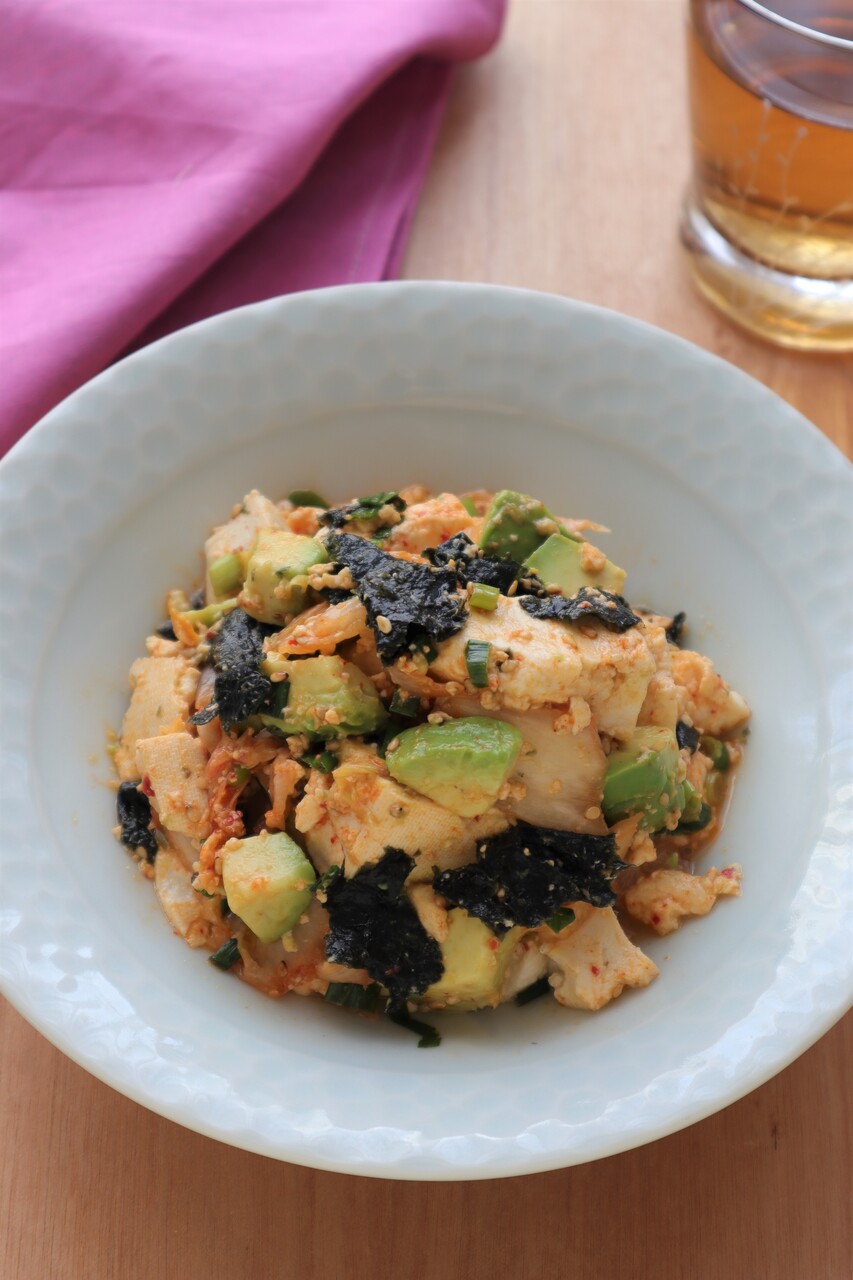 さっぱりした豆腐と濃厚なアボカドの組み合わせに、キムチのピリ辛や海苔・ごま・ねぎの風味が加わり、あと引く美味しさです!